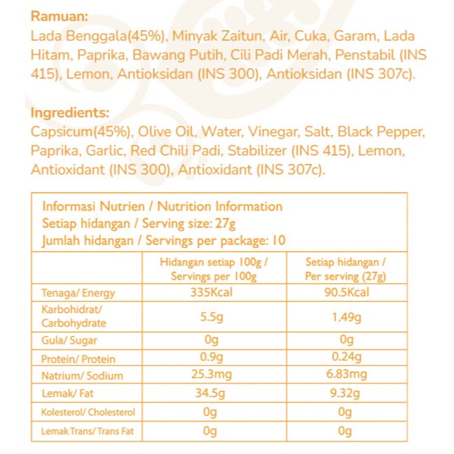 Ingredients: Capsicum, Vinegar, Black Pepper, Olive Oil, Lemon, Antioxidant (Ascorbic Acid), Salt, Chili, and Water.